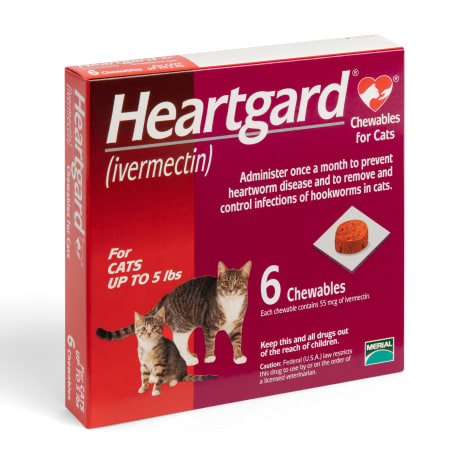 Heartgard for cats package insert. Heartworm disease in cats is expensive to treat and often fatal but cat heartgard chewables are a once a month heartworm preventative that protects your feline from infection by eliminating the tissue stage of heartworm larvae and also removes and controls hookworms. 5 to 15 lb. For cats over 15 lb use the appropriate combination of chewables. Heartgard chewables for cats is available in dosages for cats up to 5 pounds red and for cats 6 15 pounds purple in packages of 6 chewables.